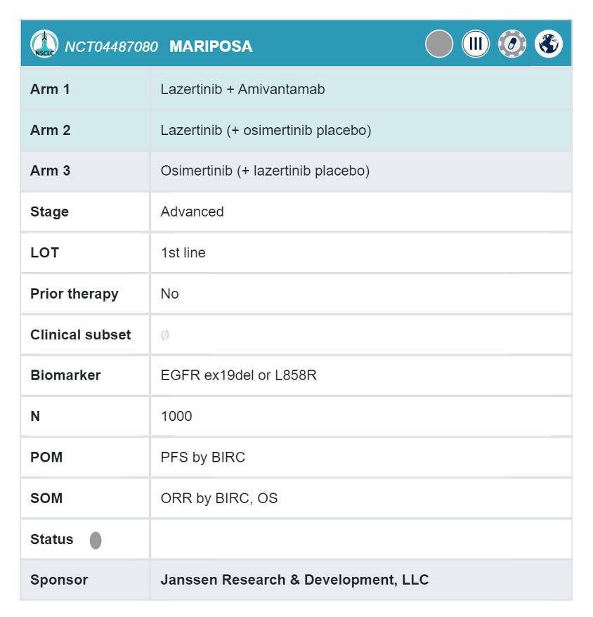 The planned phase 3 MARIPOSA study in tx-naïve, EGFRmut NSCLC compares lazertinib/amivantamab to single agent osimertinib. The study includes a third arm for single agent lazertinib, but this arm is not part of the primary analysis.